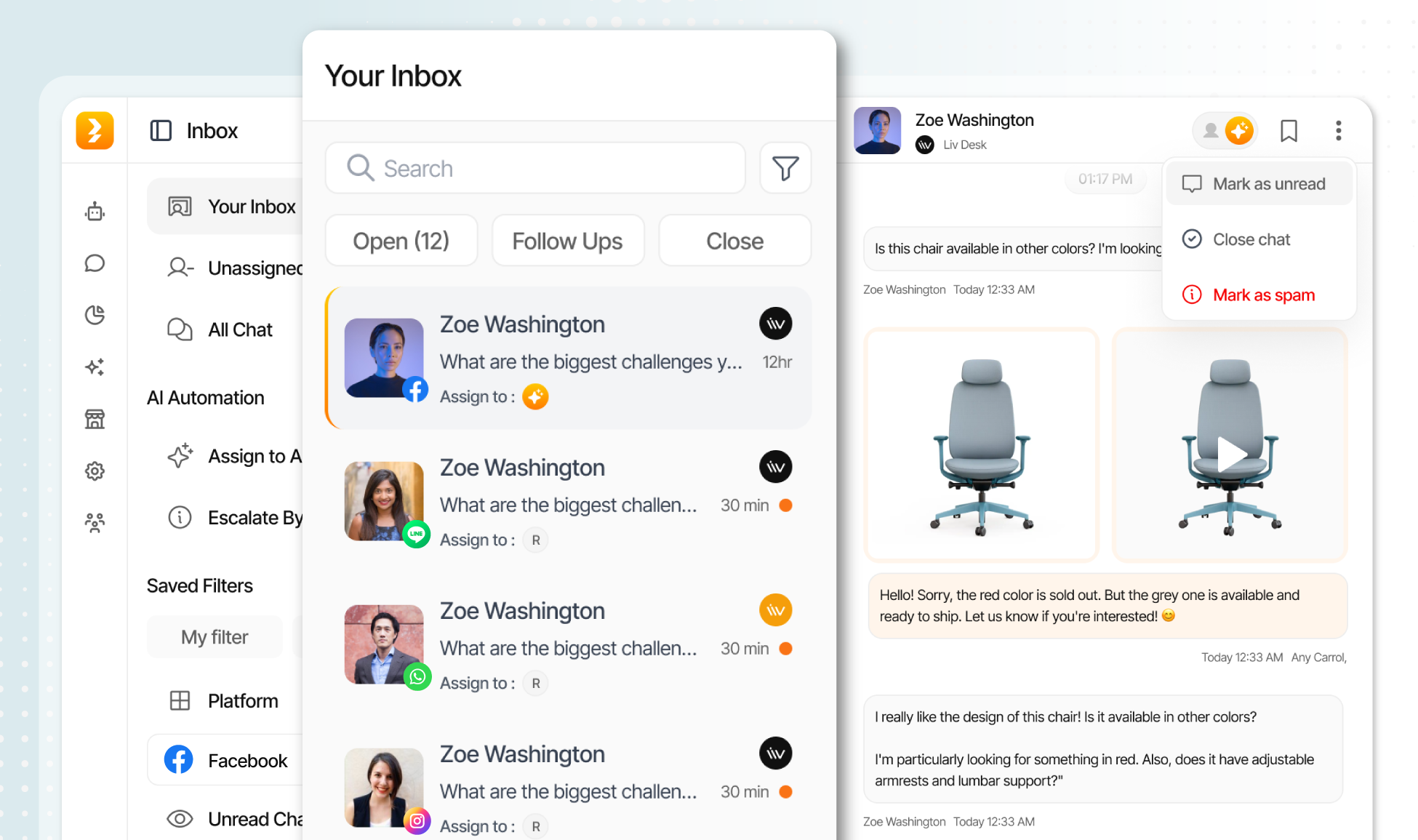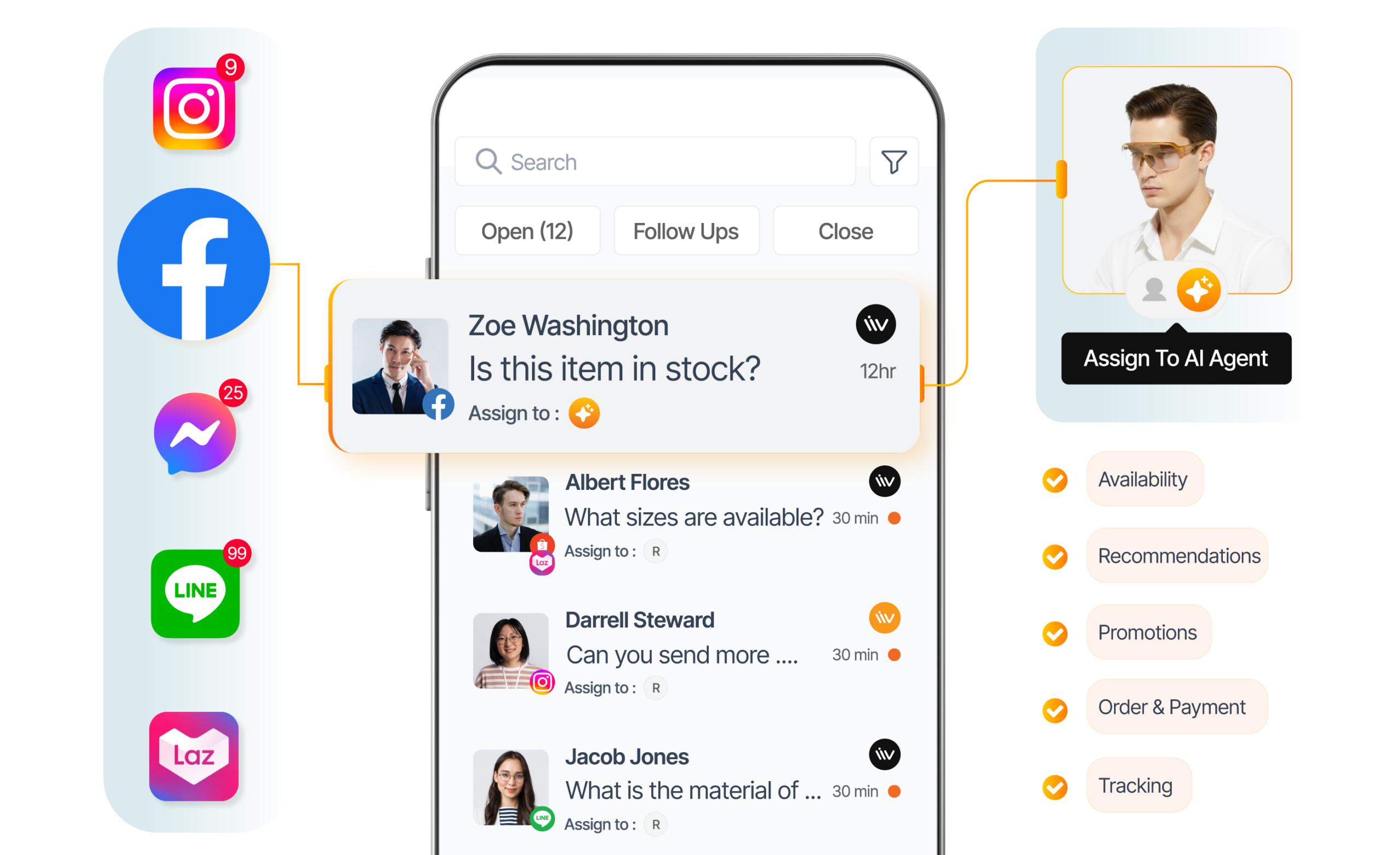 Your customers message you on Facebook, LINE, Whatsapp, Instagram, and Lazada — all at the same time. Saifa collects every conversation in one place and replies instantly, so no customer waits and no message gets missed.