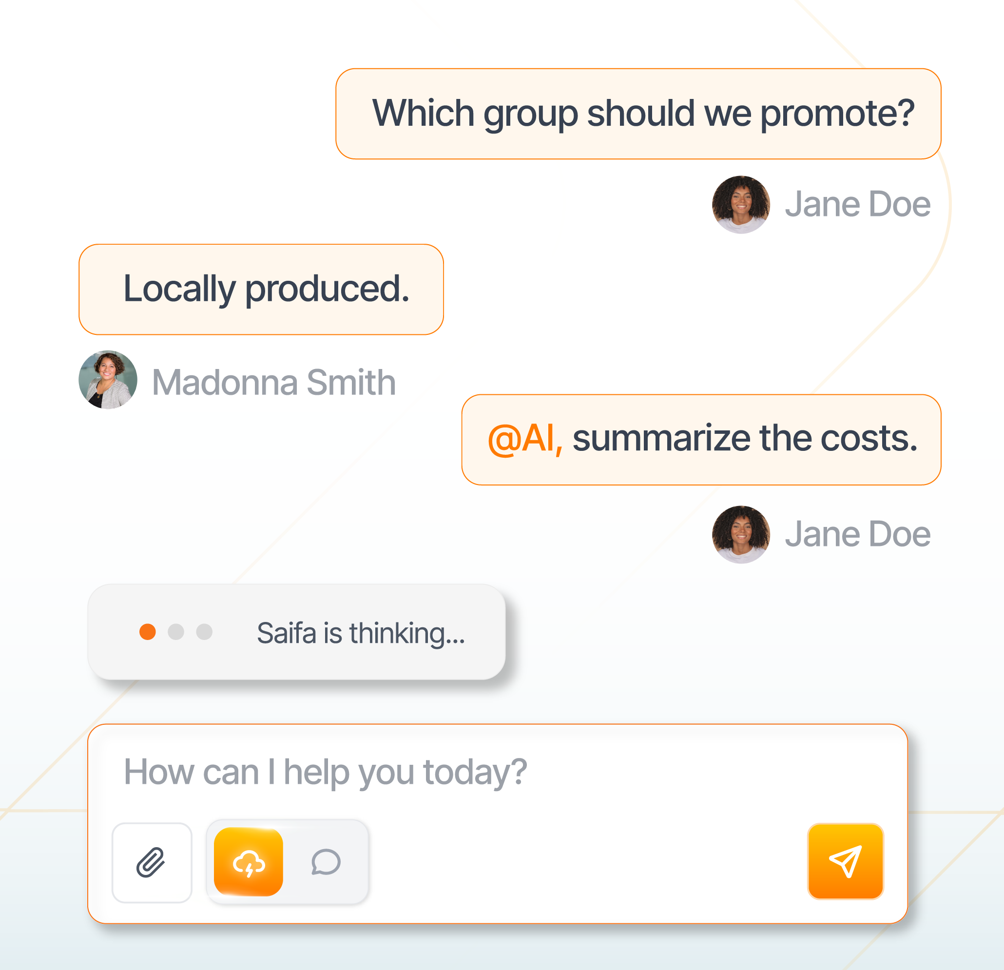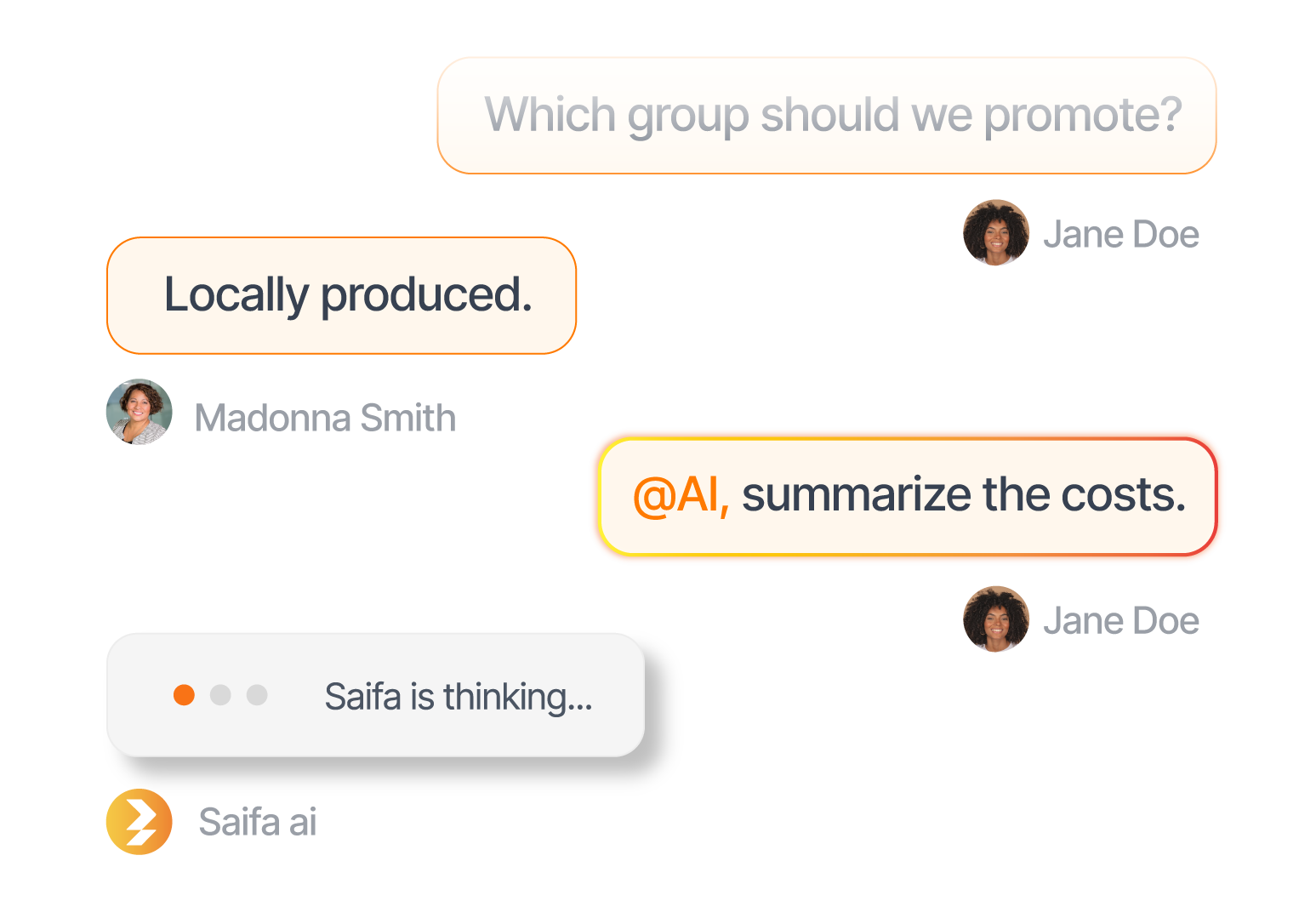Saifa AI ทำให้การทำงานเป็นทีมเป็นเรื่องง่าย เพียงแท็ก AI ใน Team Chat เพื่อรับการสนับสนุนกลุ่มในทันที หรือเข้าสู่ Studio ซึ่งเป็นศูนย์กลางความคิดสร้างสรรค์ร่วมกันสำหรับการแก้ไขและปรับปรุงเนื้อหา AI แบบเรียลไทม์