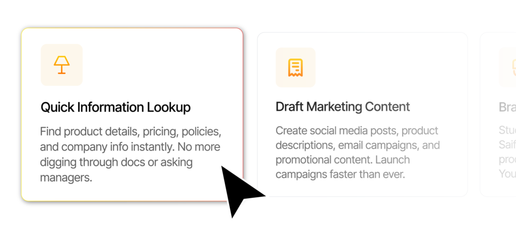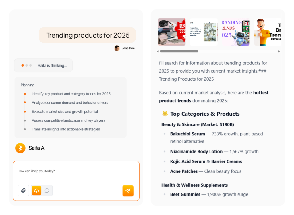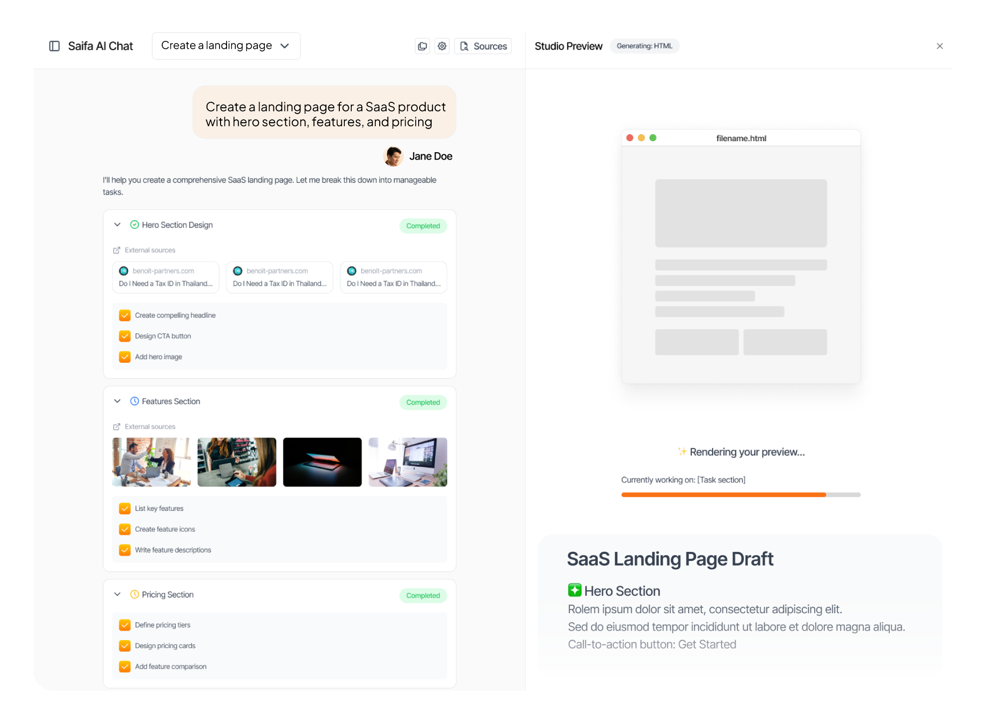ตั้งแต่การวิจัยคู่แข่งไปจนถึงการสรุปเอกสารและการดึงข้อมูลสด Saifa จะจัดการงานที่ทำให้ทีมของคุณล่าช้า เพื่อให้คุณสามารถมุ่งเน้นไปที่สิ่งที่ช่วยขับเคลื่อนธุรกิจไปข้างหน้าได้อย่างแท้จริง