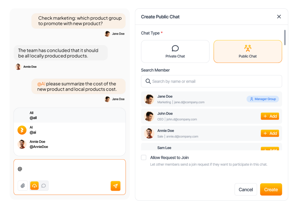 ทีมของคุณสามารถแชทและขอความช่วยเหลือจาก AI โดยตรง เพียงแค่กล่าวถึงในแชทกลุ่ม ทำให้การทำงานเป็นไปอย่างราบรื่นและรวดเร็ว