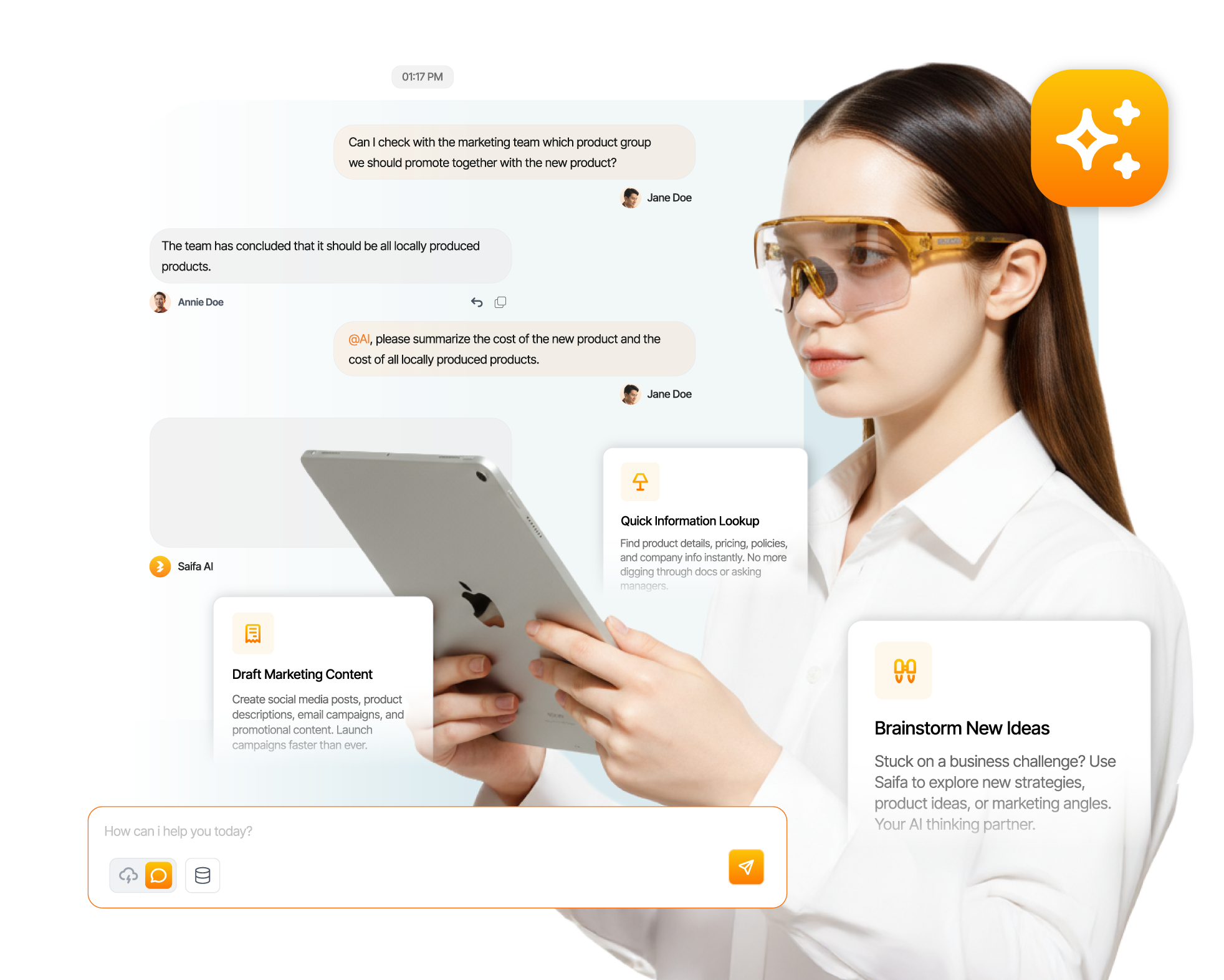 Saifa AI ผสานรวมเข้ากับเวิร์กโฟลว์ของทีมคุณโดยตรง ช่วยให้คุณสามารถระดมสมอง ปรับปรุง และสรุปเนื้อหาในสภาพแวดล้อมดิจิทัลที่เป็นหนึ่งเดียว